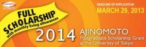 Application for the 2014 Ajinomoto Postgraduate Scholarship Grant is now open. The successful applicant will receive full scholarship in one of the graduate schools in the field of science and technology at the University of Tokyo. The scholar can enroll either as a research student first then as a master’s course student in a three-year program or directly as a master’s course student in a two-year program. Other benefits include monthly living allowance; full coverage of examinations, admission and tuition fees; full coverage of Japanese language learning prior to going to Japan; and full coverage of airfare to and from Japan.