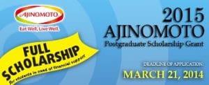 For interested applicants, log on to www.ajinomoto.com.ph for more details on the scholarship grant. Deadline for applications is on March 21, 2014. For inquiries, contact Ms. Pinky Yu at telephone numbers (02) 890-6329, 895-6081 to 89 local 346, fax number (02) 897-5766 or email address pinky_yu@ajinomoto.com.