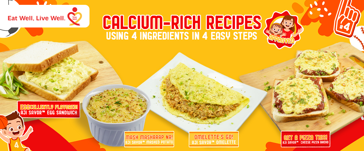 The Culinary Nutrition Team of Ajinomoto puts together a treat for kids to enjoy and for homemakers to conveniently prepare and serve. Try to make these 4 calcium-rich recipes using 4 ingredients done in 4 easy steps made with AJI SAVOR™ on Rice Topping Mix and 4 protein-rich recipes using 4 ingredients done in 4 easy steps made with Prottie® Soymilk Drink Mix.